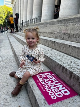 Sawyer, a child born after successful Abortion Pill Reversal sits on the steps at the State Capital in Columbus, Ohio in October 2025.