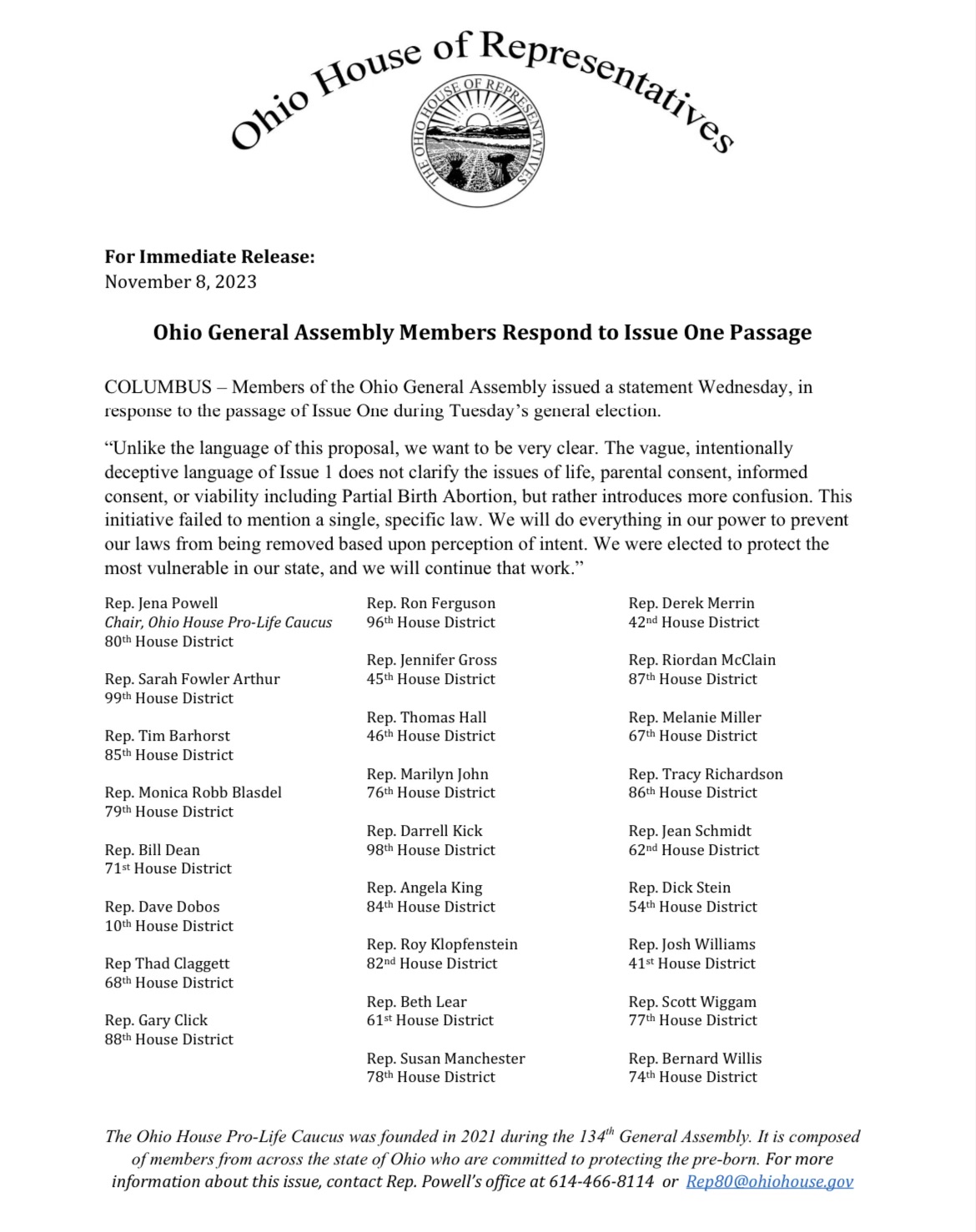 “Largely bought by outside special interest groups such as the ACLU and Planned Parenthood, who funneled millions of dollars into the Ohio election to ensure this very broad and very extreme initiative would pass,” she said. “Rather than protect the most vulnerable citizens of their state, this amendment goes to great lengths to protect abortion providers and disregard parental rights.”