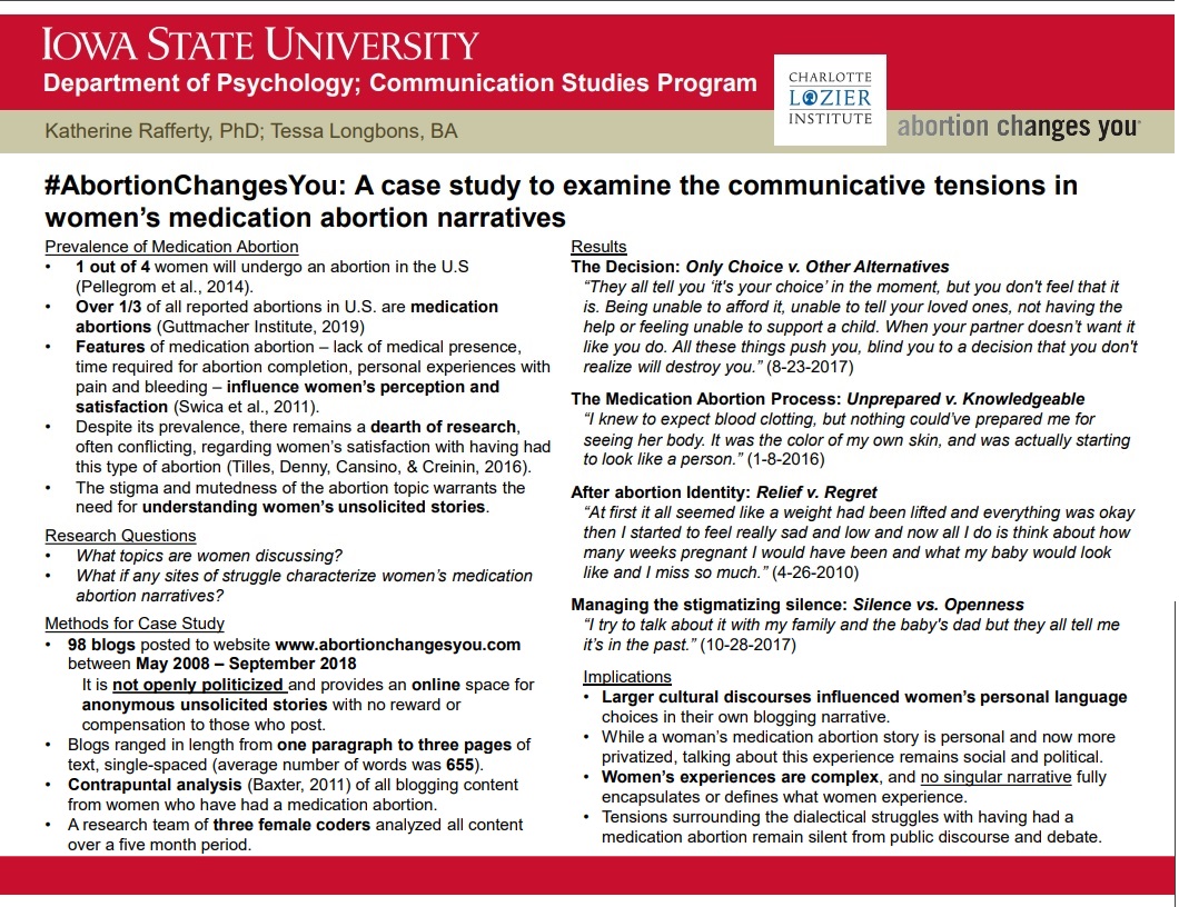 Titled, “#AbortionChangesYou: A Case Study to Understand the Communicative Tensions in Women’s Medication Abortion Narratives,” the study was authored by Dr. Katherine A. Rafferty, of Iowa State University, and Tessa Longbons, from the Charlotte Lozier Institute.